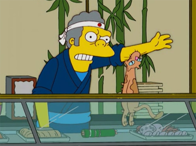 - Influenciado pela profecia de Homer, Moe vende o bar para um empresário japonês e doa o dinheiro para um orfanato. Sem apocalipse e sem dinheiro, Moe se obriga a continuar trabalhando ali, agora preparando sushi, fedendo a peixe e levando mordidas de gatos.