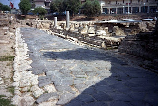 Uma estrada romana em meio à cidade (à esquerda), com o pavimento quase intacto e colunas ao longo, faz contraste com a modernidade ao fundo .