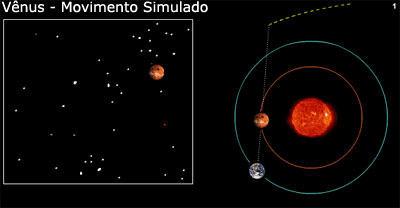 A próxima animação foi criada para ajudar a esclarecer este comportamento visual. Informo que é meramente ilustrativa, não obedecendo ao formato das órbitas dos planetas, efemérides (tábuas astronômicas que indicam as posições planetárias) ou escalas de correspondência proporcional com suas dimensões reais. Além disto, para fins didáticos, serão exibidos apenas o Sol, Vênus e a Terra.